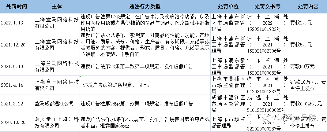 去年6月份,上海盒馬網絡科技有限公司因違反廣告法第28條第二款的相關規定,發佈虛假廣告,被重罰50萬元等等。