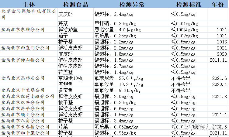 如**在盒馬北京諸多分公司歷年來的抽檢中,水產品的重金屬鎘超標占了絕大多數,20件超標抽檢中,鎘超標占了13件,涉及產品主要是皮皮蝦、各類蟹等,超出檢測標準的2倍到7倍不等,**而像多寶魚、鱸魚等是抗生素氧氟沙星超標;