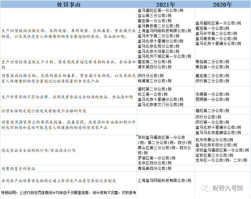 同樣因“生產經營致病性微生物,農藥殘留、獸藥殘留、生物毒素、重金屬等污染物質以及其他危害人體健康的物質含量超過食品安全標準限量的食品、食品添加劑、食品相關產品”等各類食品安全違法行為,盒馬在2021年領到了至少29張罰單,2020年至少領到了24張罰單。