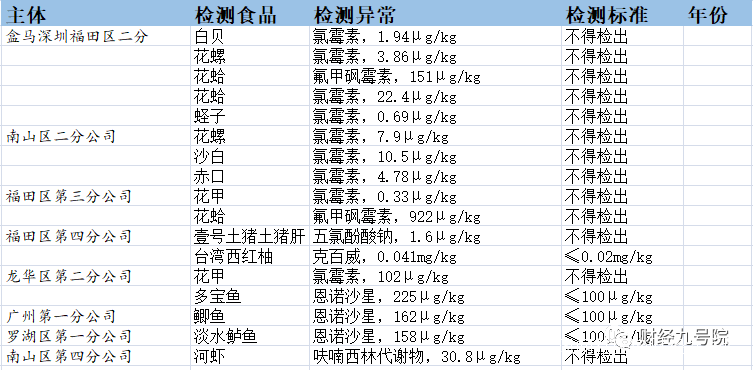 在盒馬深圳分公司檢測出的主要也是海產品的抗生素超標,如花蛤、花螺以及各種貝類,主要是氯黴素超標,多寶魚、鯽魚、鱸魚等主要出現恩諾沙星超標。