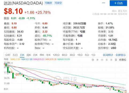 營收與兩大核心平台都迎來增長,這推動着資本熱情高漲。截止3月9日美股收盤,達達股價為8.1美元/股,大漲25.78%,總市值達到18.79億美元。
