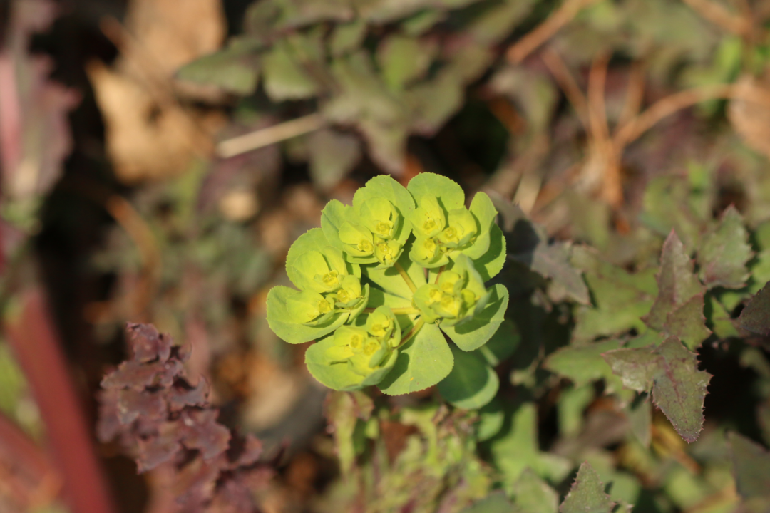 澤漆是大戟科大戟屬一年生草本植物,全國廣泛分佈,在荒野、山坡、路邊、林地隨處可見。莖直立,多分枝;莖頂向上伸出五枝葉狀苞片,像五朵綠色的祥雲環聚在一起,“五朵雲”、“五杯草”的俗名也由此而來;葉互生,像湯匙形狀;花朵黃綠色;蒴果三稜形,光滑無毛,有明顯的三條縱溝,果實成熟時會分裂成三個果爿,裏面有暗褐色的小種子。