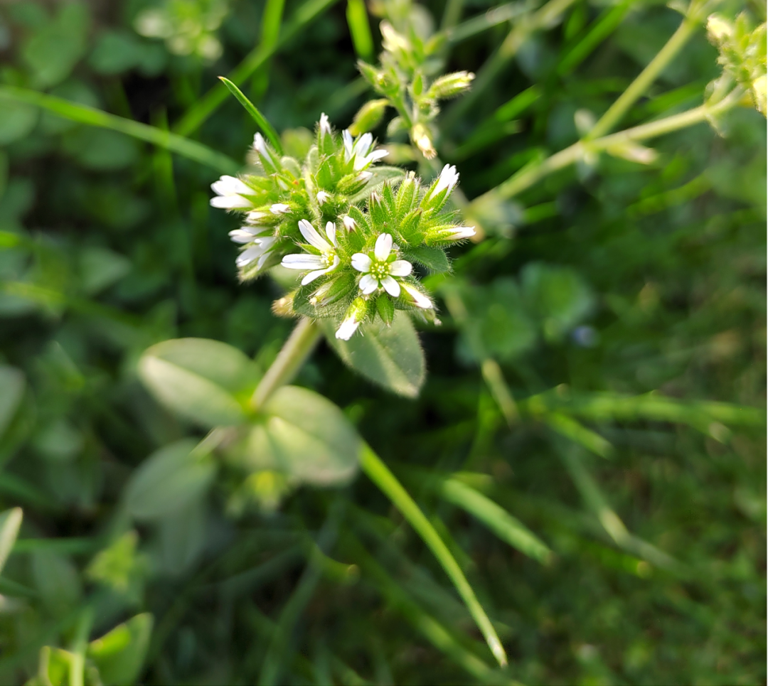 同為石竹科這個大家族的卷耳,植株特徵明顯,長在雜草叢中,非常好識別。莖的基部匍匐在地上,但上部是直立生長,全身長滿了密密的細柔毛;葉片摸起來也毛絨絨的,頂端微微外卷;花朵很小,有5枚白色花瓣,細細觀看每一枚花瓣,會發現花瓣的中間都有一條淺淺的裂口,雄蕊有10根,花柱5個;果實為長圓形蒴果,裏面有褐色的小種子,種子表面有瘤狀凸起。