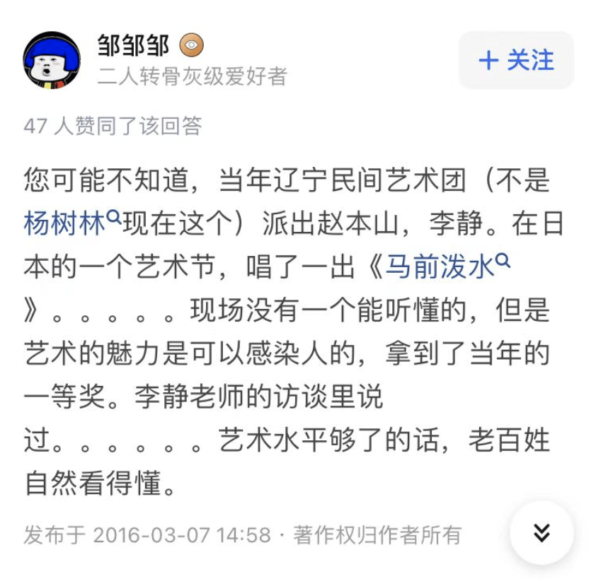 説這些,主要是想表達正統的二人轉不僅一點都不俗不可耐,同樣也不是高不可攀。正如知乎用户@鄒鄒鄒所説的,其實只要“藝術水平夠了的話,老百姓自然看得懂”。