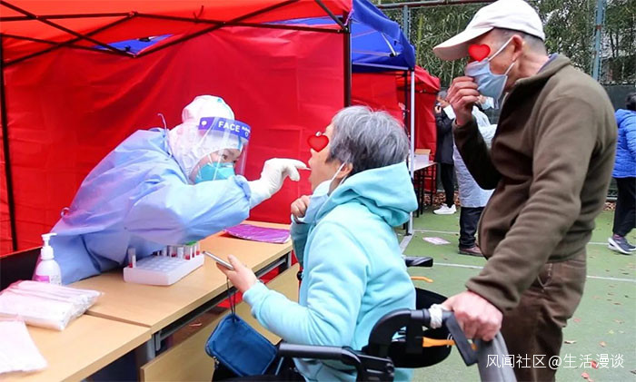 “爺爺,你在外面等一下,我出來給你採。”每當看到有坐着輪椅,行動不便的老人,李僑麗都會主動從核酸採樣台出來,彎下腰、俯下身,甚至直接屈膝半跪在地上,為老人完成採樣。讓老人和家屬都深受感動,讚歎不已。