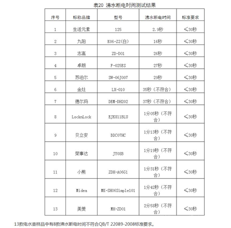 比較測試中,小熊電器一款電水壺(型號:ZDH-A06G1)沸水斷電時間為1分31秒,而標準要求則為不超過30秒(≤30秒),不符合QB/T 22089-2008標準要求。