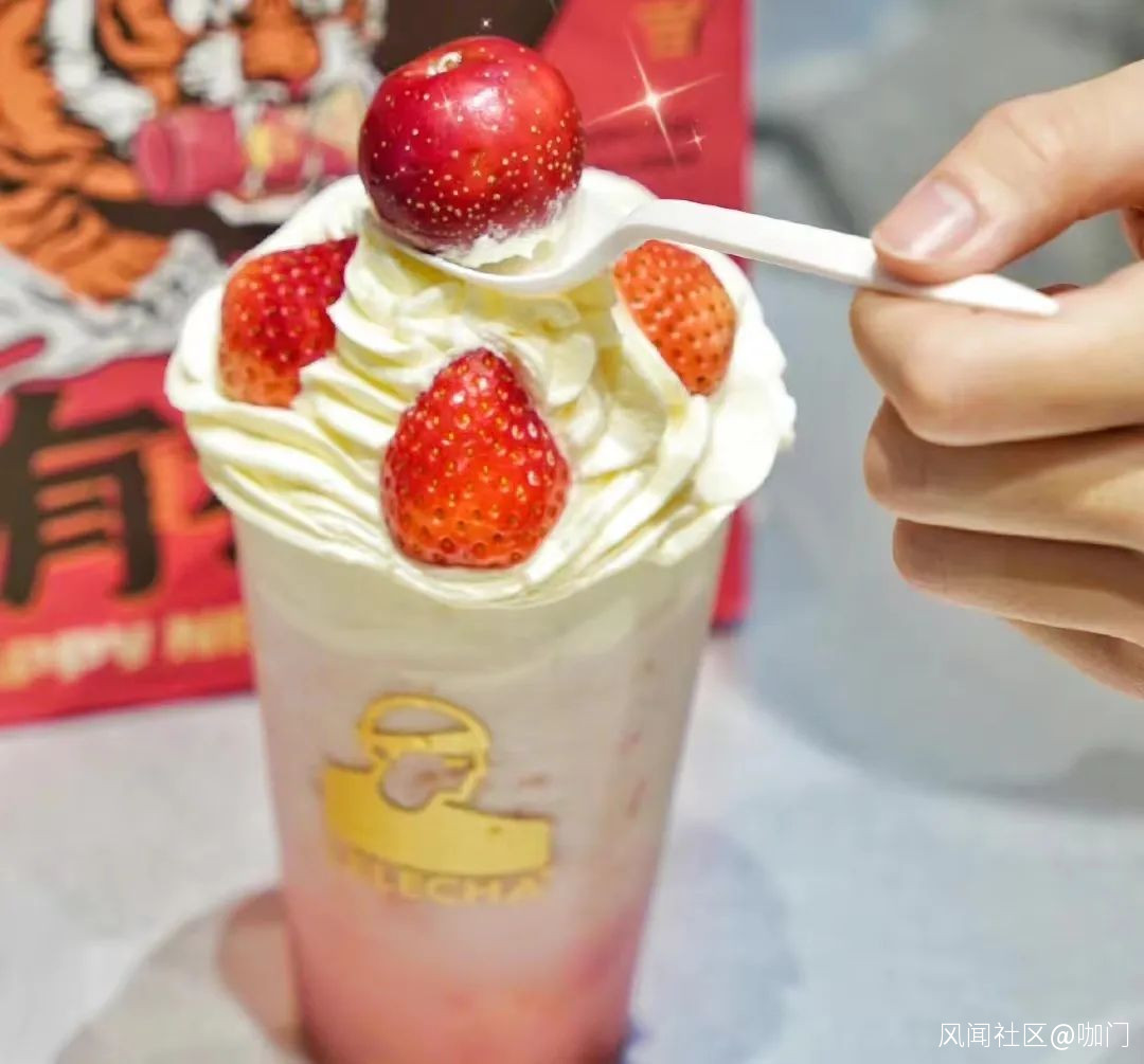 隨着市場對水果品種的關注,茶飲店的常用草莓也聚焦到以“紅顏”為主,喜茶、奈雪、樂樂茶、茶百道等都在用。