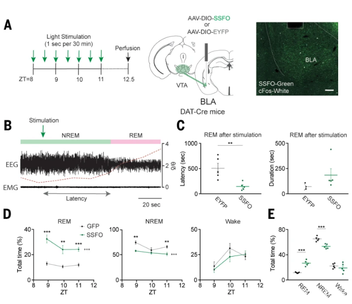 在這項研究中,研究人員們通過在體神經記錄、光遺傳學操作等技術手段,發現在關係到情緒處理的腦區——**基底外側杏仁核(basolateral amygdala,BLA),短暫增加的多巴胺會作用於表達多巴胺受體Drd2的神經元,讓小鼠終止NREM睡眠,並啓動REM睡眠。**多巴胺作用於基底外側杏仁核中表達多巴胺受體Drd2的神經元,會誘導NREM睡眠到REM睡眠的轉變。