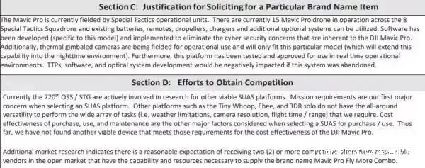 美軍自己也對禁令頗有微詞,這一年8月,美國空軍特種部隊向上打了個採購報告,表示我們試了美國本土的Tiny Whoop、Ebee、3DR Solo,但都無法滿足需求。“由於作戰任務緊急又缺乏本土替代品,希望特批採購35架大疆無人機Mavic Pro鉑金版。”