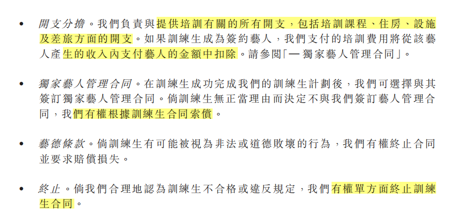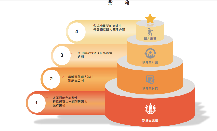 此外,樂華主要通過唱跳比賽、全球選拔網絡及社交媒體平台等方式物色人選。業務期內,樂華受到超過58000份訓練生計劃申請,在2019-2021年,新簽約的訓練生數量分別為19人、28人、50人,整體錄取率不高於0.3%。
