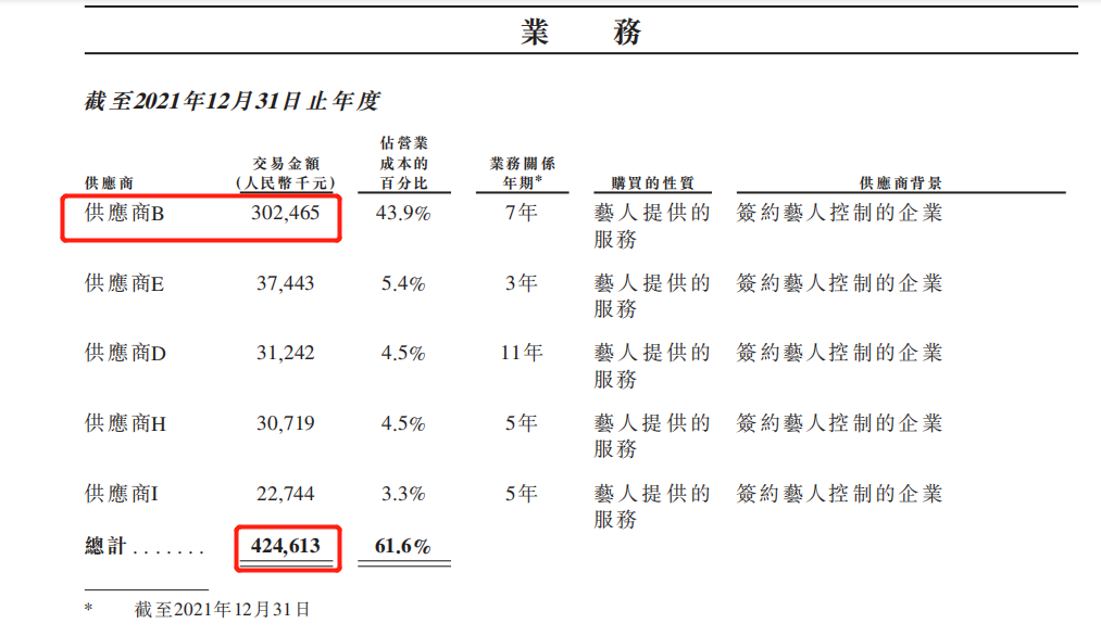 過分依賴單一藝人,是樂華最大的隱憂。招股書披露了業務記錄期內的前五大供應商詳情,其中供應商B引起了關注。其2021年交易金額達3.02億元,佔營業成本比重43.9%。結合業務關係年期、交易金額等信息,業內猜測“供應商B”可能是旗下頂流藝人王一博。