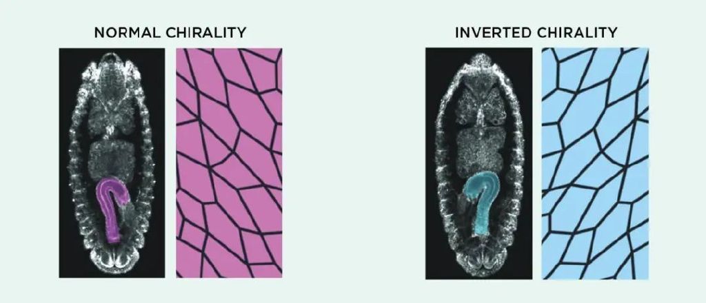圖7. 果蠅腸胃反轉:正常果蠅發育過程中,後腸會經歷逆時針旋轉,最後向右彎曲(左)。研究者敲除掉參與細胞骨架功能的蛋白後,扭轉了後腸的旋轉方向,得到了指向左側的後腸(右)。丨來源:M. INAKI ET AL., FRONT CELL DEV BIOL, 6:34, 2018.