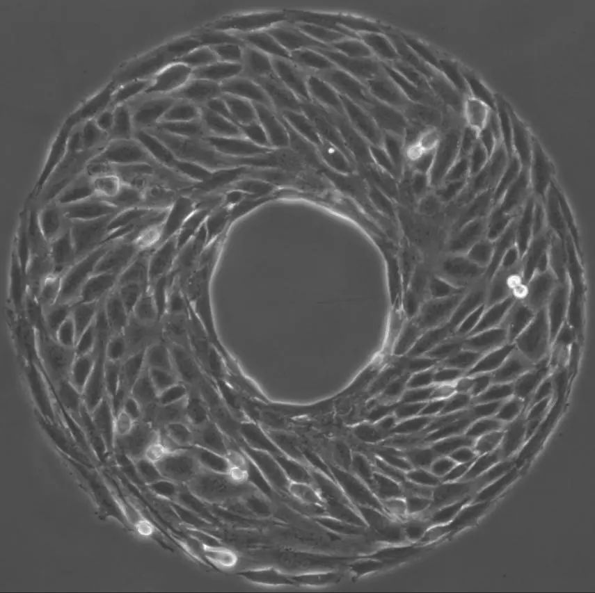 圖2. 細胞“甜甜圈”:小鼠肌肉細胞長出了一個圓環圖案,顯示了逆時針旋轉的手性(萬羣供圖)