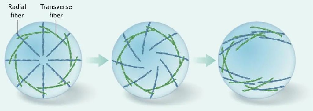 圖5. 細胞骨架形成過程中的旋轉現象。手性在細胞內得以建立,可能的方式之一便是構成細胞骨架的這些微絲纖維有自發的組織排列。在細胞骨架建立的最初幾個小時裏,這兩類纖維組成輻射對稱的模式(圖5左),但從三個小時之後,輻射纖維開始傾斜,拉拽得橫貫纖維偏離軌跡,引發渦旋模式(圖5中),11小時左右,渦旋模式打破為線性模式,纖維沿着細胞主軸排布(圖5右)。