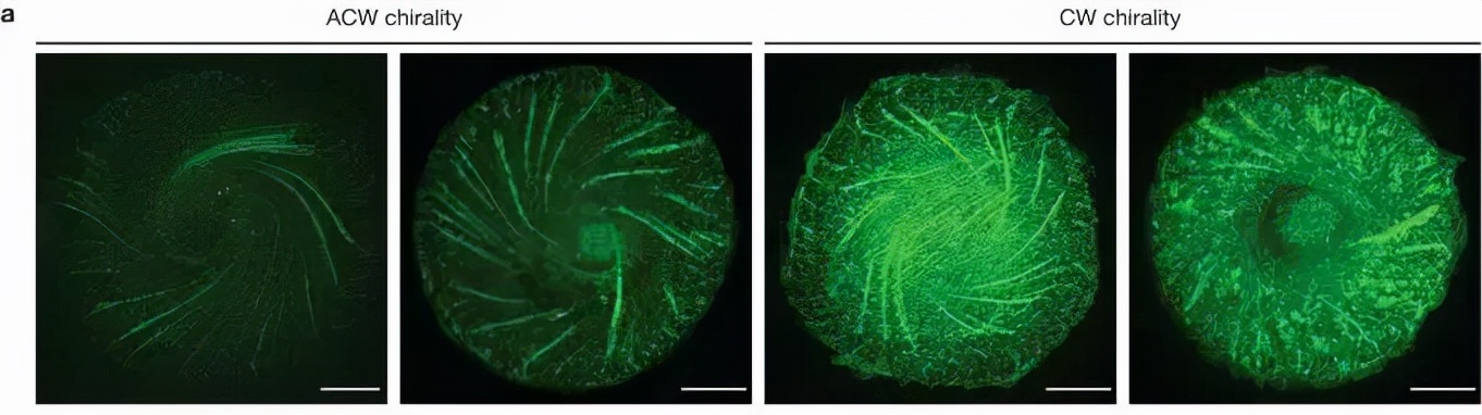 為了更好地瞭解不同因子在生物體宏觀尺度上如何驅動手性,研究人員嘗試了更能模擬自然條件的實驗設置來觀察細胞手性。例如,萬羣等人開發了一項三維的微型圖案技術(萬羣也是細胞手性研究領域中與微型圖案技術相關的專利的發明人之一),可以更好地復刻胚胎髮育環境,進而檢測上皮細胞所形成的微球體的旋轉行為[6]。研究團隊發現,絕大部分微球體按逆時針方向旋轉,但當有藥物阻斷微絲組裝時,大部分微球體開始順時針旋轉,就像按下了某個轉換開關一樣。