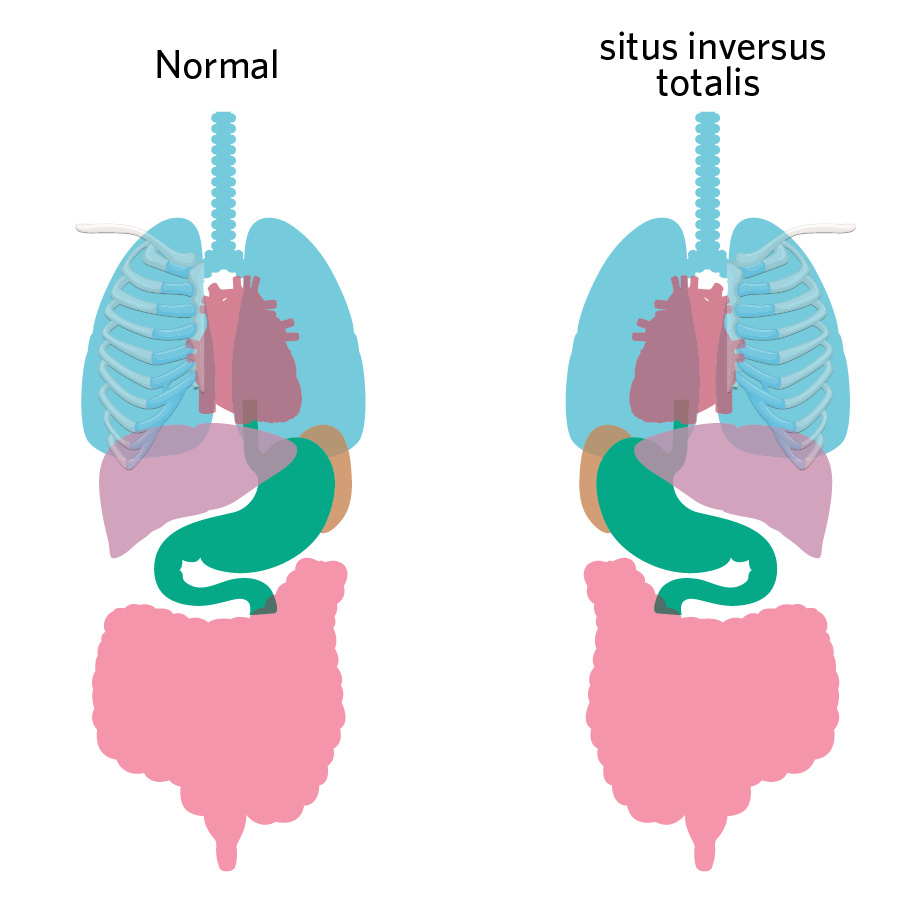 例如,有一些人的臟器左右位置和正常人完全相反,正常在右側的器官會出現在左側,反之亦然。當全部器官都處在正常位置的相反一側,我們把這一現象稱為全內臟反位(situs inversus totalis)(圖4)。這種情況在人羣中出現的概率大約為萬分之一。由於器官之間的相對位置關係沒有改變,這一情況並不一定對身體有害。然而,如果只是個別器官異位,例如左位心(levocardia,除了心臟其他器官均對側異位)、右位心(dextrocardia,只有心臟出現在對側),或是內臟異位(situs ambiguus,有異位和沒有異位的器官混在一起),病人往往會出現心臟病等醫學症狀,原因便是異位器官無法與其他器官正確協作。