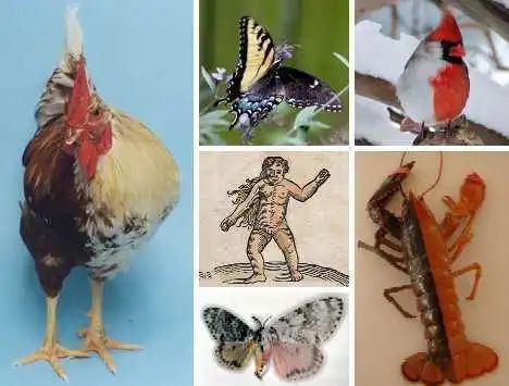 圖8. 雌雄嵌體動物。儘管大部分雌雄嵌合體出現在昆蟲和蛛形綱動物中,但在一些相對高等的動物,包括甲殼類、北美紅雀、雞等之中也會出現。丨圖片來自新浪圖片站http://slide.tech.sina.com.cn/d/slide_5_453_35289.html#p=1