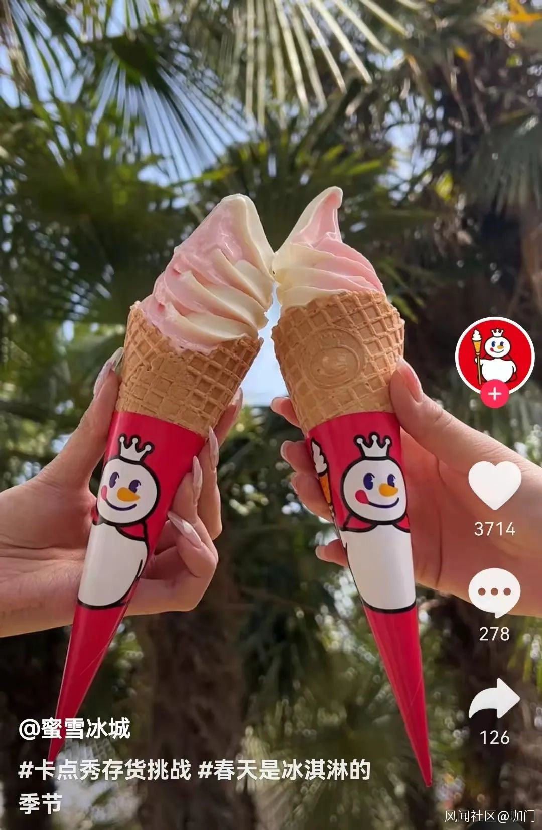 最近刷抖音,被蜜雪冰城“春天是吃冰淇淋的季節”這句slogan洗腦了。