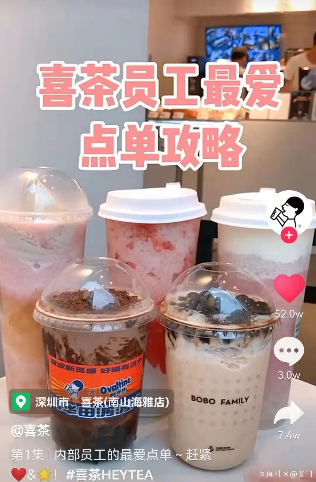 喜茶的“喜茶點單攻略”下的播放量達到1564.3萬,合集中一條20秒的視頻就有52萬點贊,3萬評論,芝士換酸奶、雙拼加冰淇淋球……花樣喝喜茶,先從官方看起。