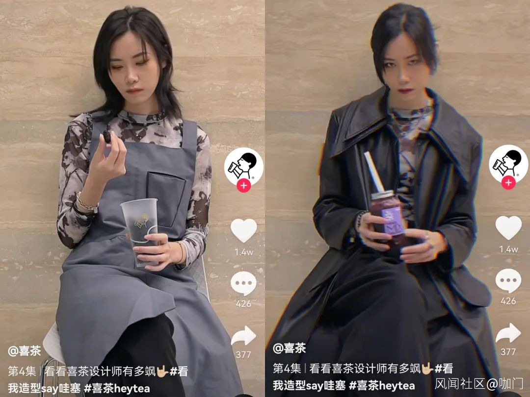 喜茶則有設計師變裝,拿着裝滿桑葚杯子的女生畫面一轉,變成手捧滿瓶多肉桑的帥氣小姐姐。