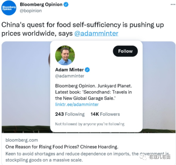 但是美國《彭博社》卻發表文章評論稱,這一輪糧價上漲主要怪中國,理由是中國追求糧食自足的國家戰略,所以囤積了很多糧食,因此推高了全球糧價。