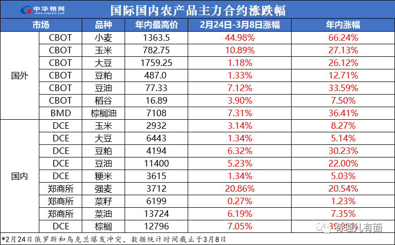 在美國的持續拱火造勢下,手握世界“糧袋子”和“油桶子”的俄烏兩國開戰,給世界經濟扔下了一顆重磅“炸彈”,不僅全球石油和天然氣價格持續上漲,近日國際糧價也出現暴漲。芝加哥期貨交易所公佈的小麥期貨價格一度上漲了66.24%,官方數據稱,當前糧食價格正處於近十年來最高水平。