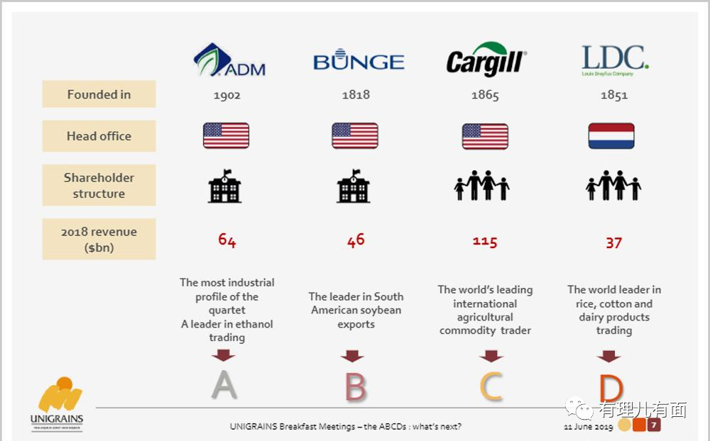 全球公認的四大糧商,ADM、邦吉、嘉吉和路易達孚(簡稱ABCD),前三個總部位於美國,路易達孚雖在法國,但背後也有美國資本注入,可以説都是在美國政府的扶植下,孕育而生的。