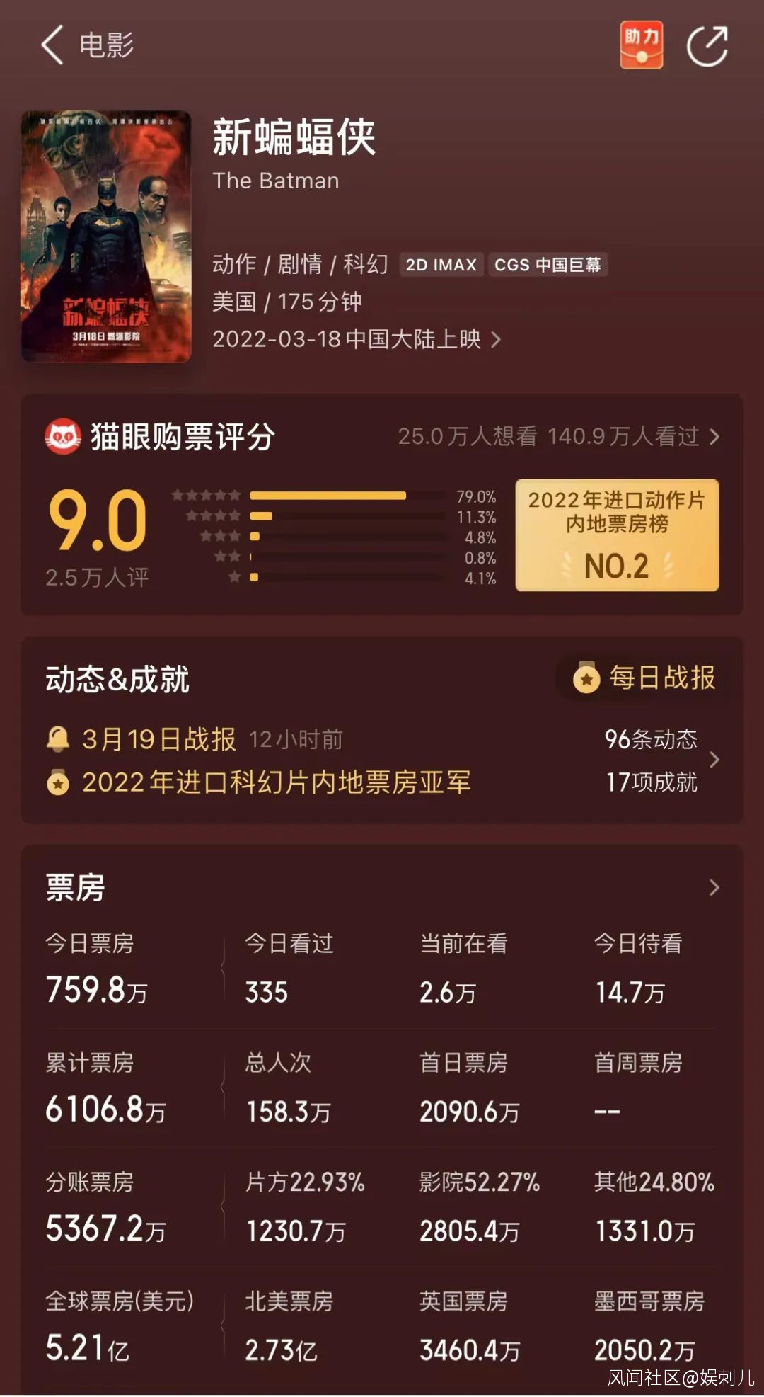 而《新蝙蝠俠》僅半個月,截至3月20號,全球票房便已達5.21億美元。在中國大陸上映僅三天,《新蝙蝠俠》的票房也突破6000萬元,排片率保持在35%左右,超越同檔期上映的進口電影《神秘海域》。