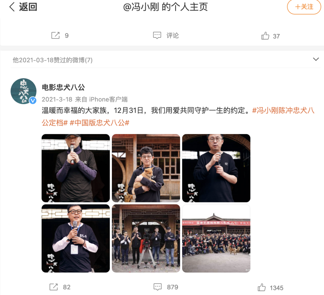 △馮小剛上一條微博動態,停留在給自己的電影點贊。