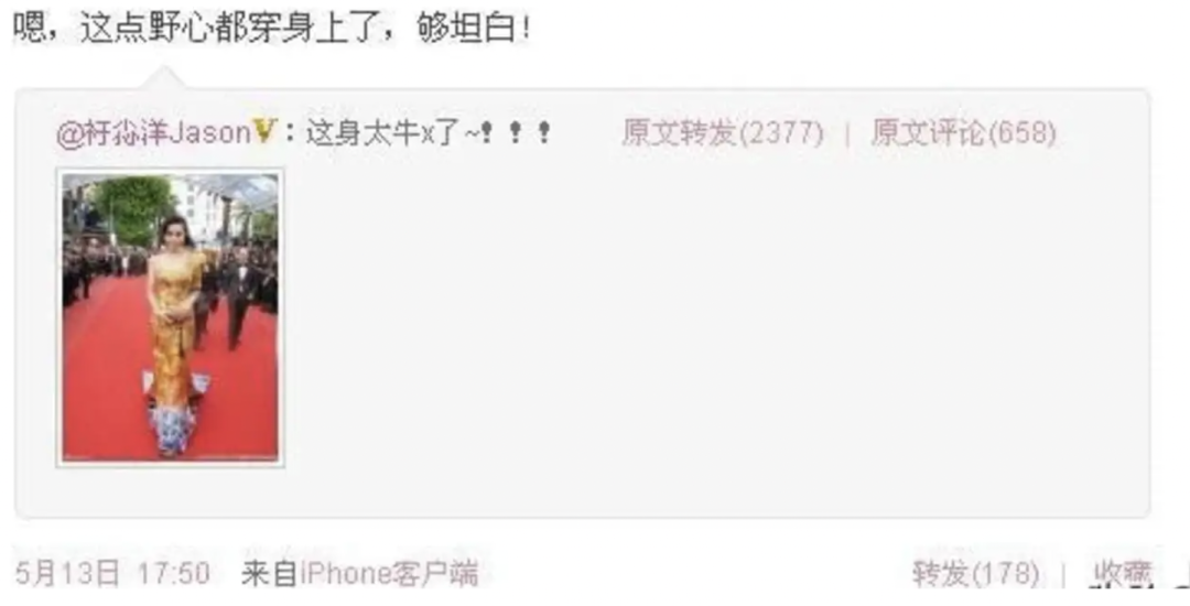 2010年,范冰冰的龍袍造型引發爭議。秦海璐直接轉發評論:“嗯,這點野心都穿身上了,夠坦白!”