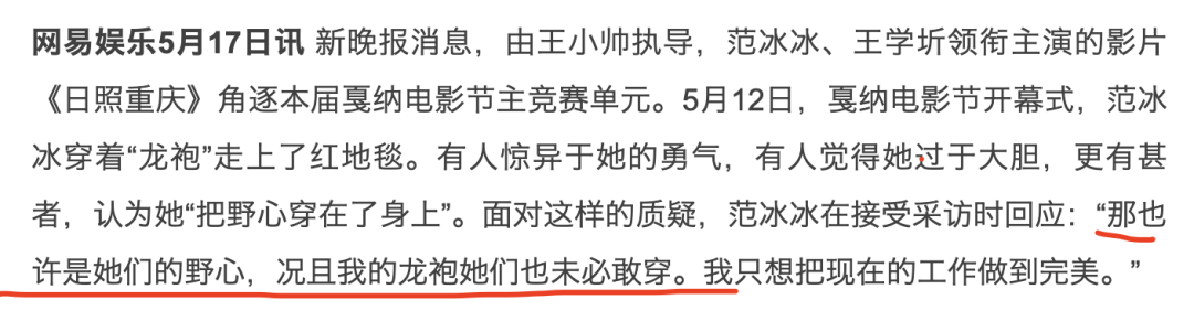 范冰冰自然也不會善罷甘休。她在採訪中回應:“那是她們的野心。我的龍袍她們未必敢穿。”(看,以前的頭條多有料)