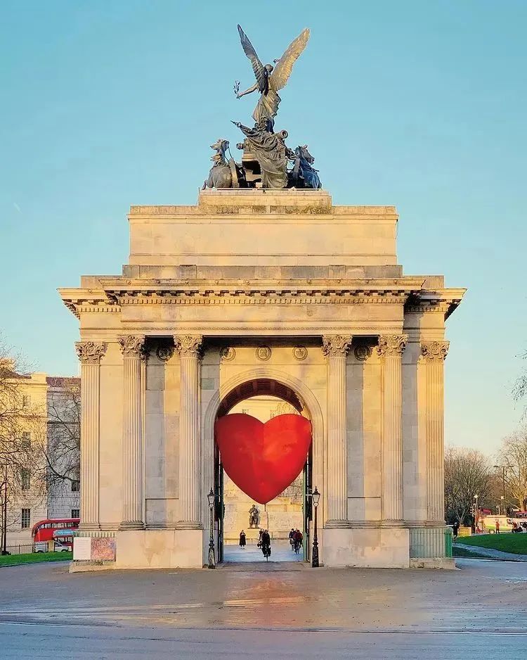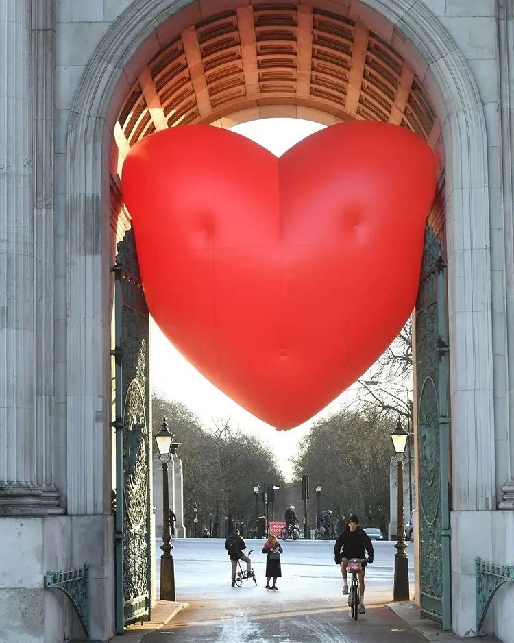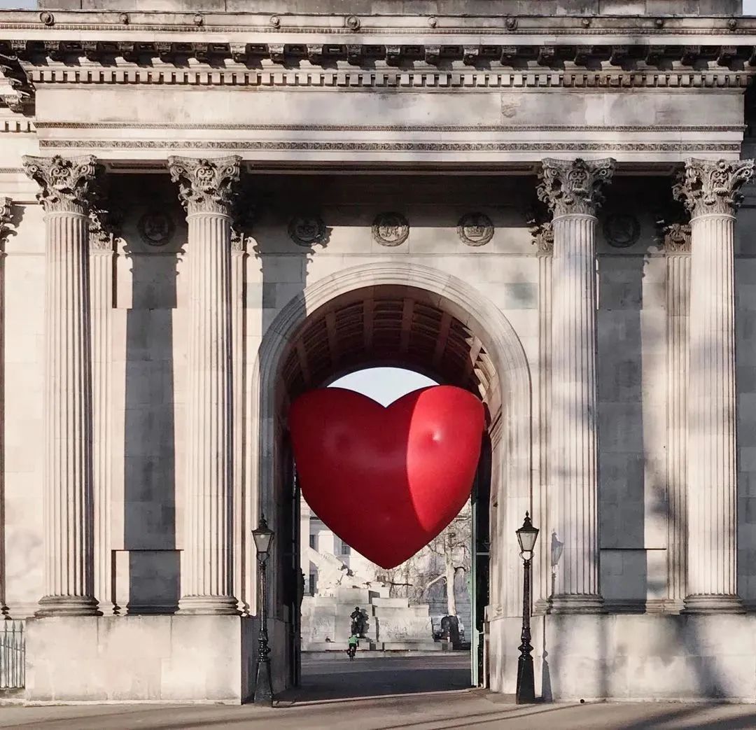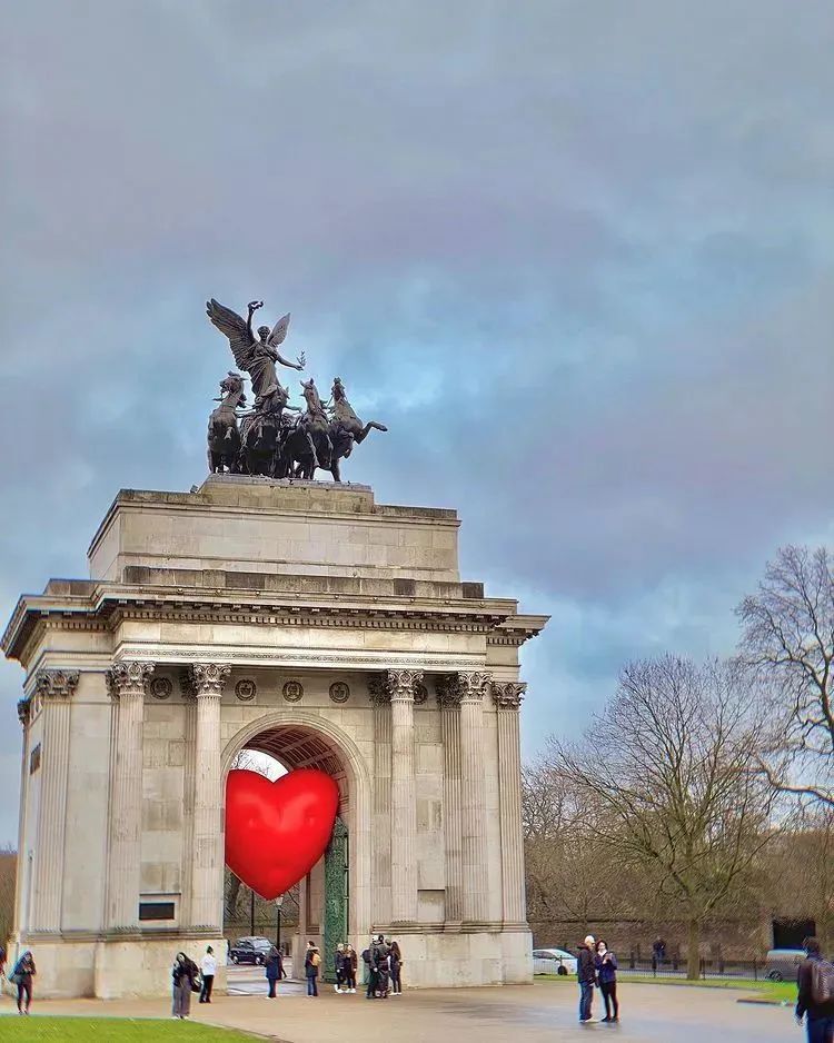 今年的2月14日,倫敦海德公園的威靈頓拱門出現了一顆胖乎乎的紅色愛心氣球。