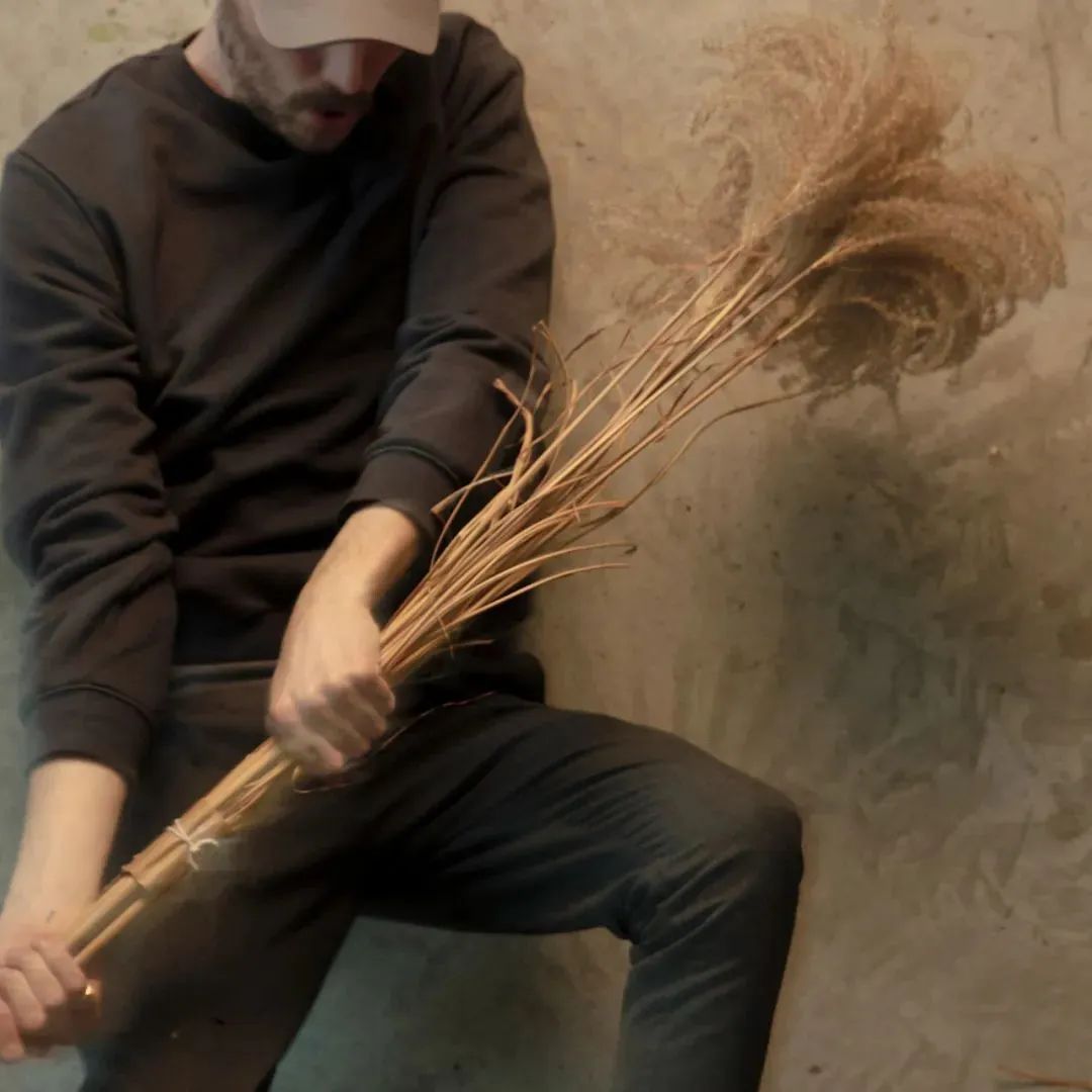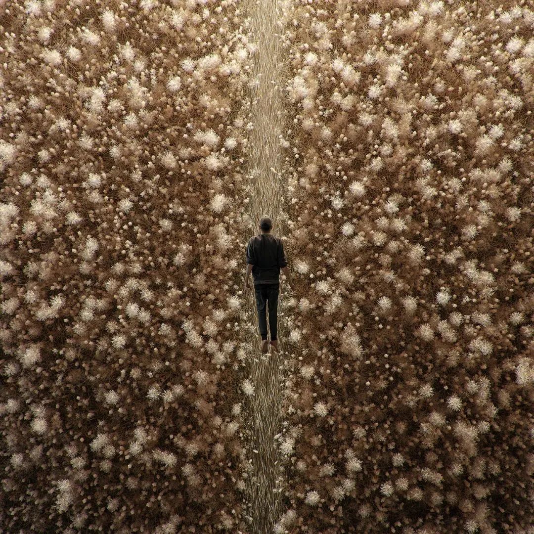 望着懸掛於上空的乾草,又像是從天空向下俯瞰金黃色的麥田。