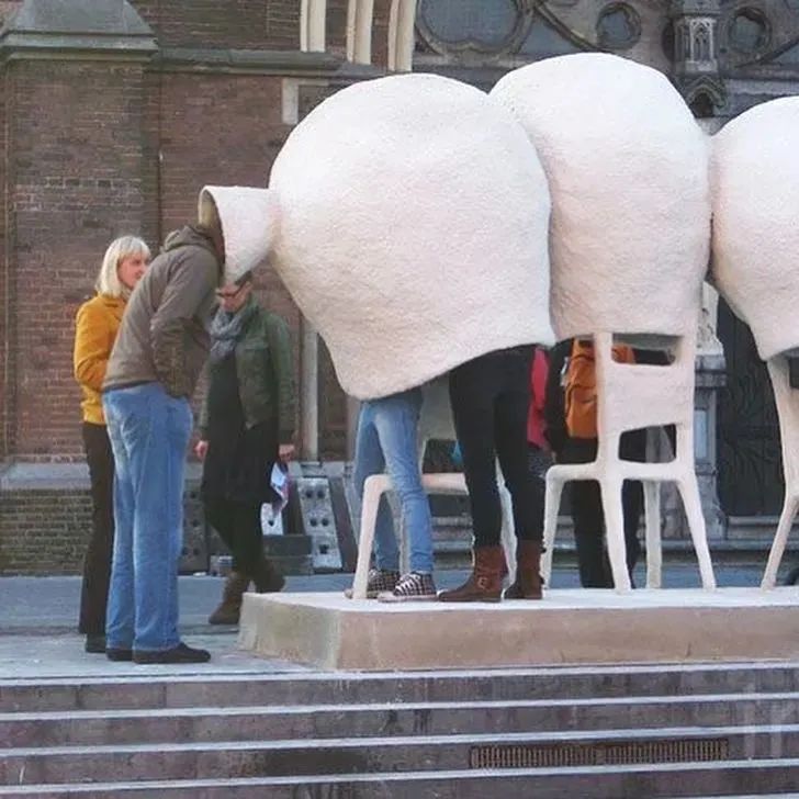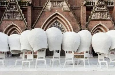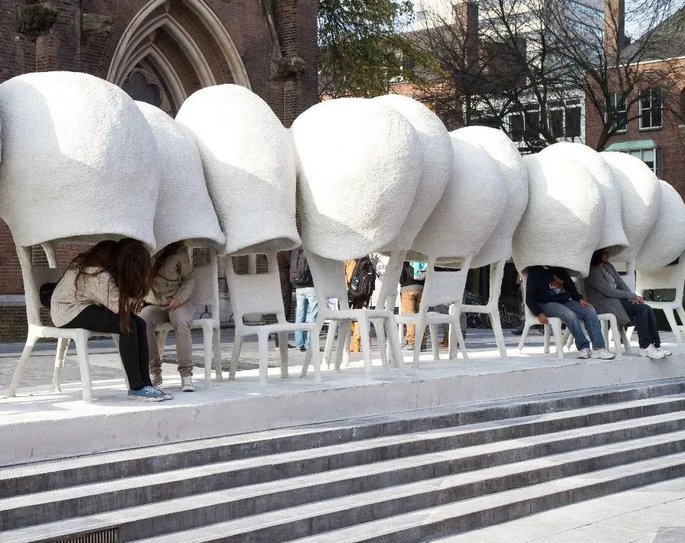 將洞穴和座椅相結合,以金屬絲、膠體和再生紙製作而成,一個帶有繭狀洞穴的創意作品,坐在椅子上的人可以通過繭洞交流。