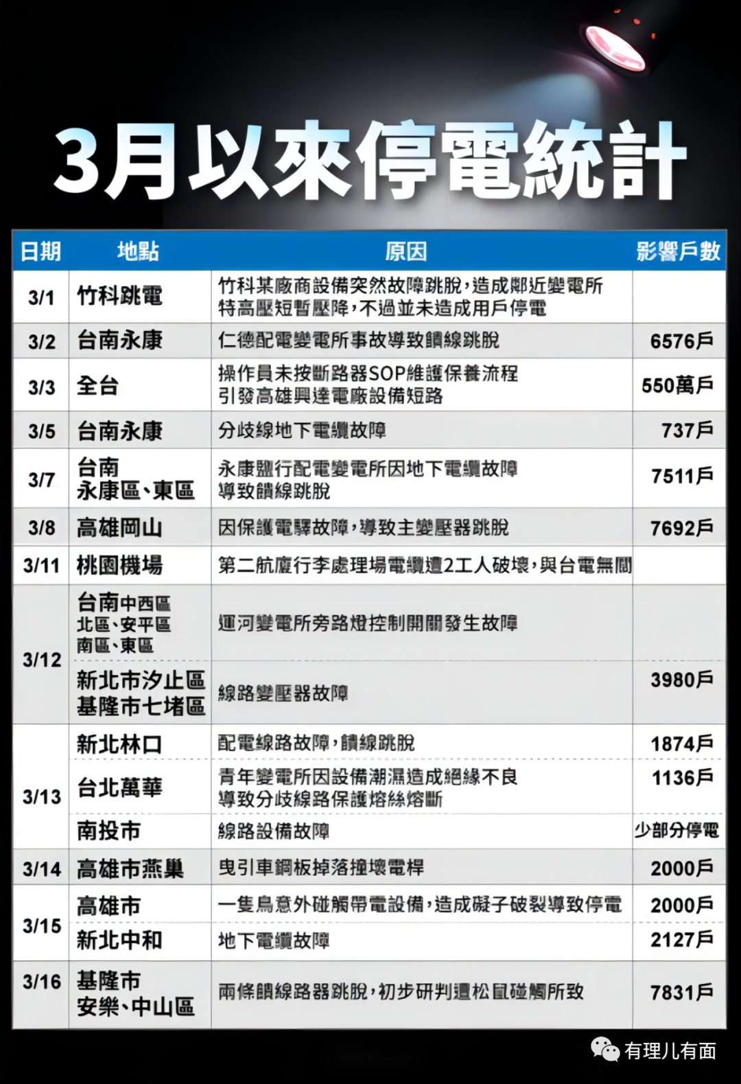 二是供電設備故障。如3月5日台南永康因分歧線地下電纜故障,導致737户停電,僅僅兩日過後,該地區因同樣原因再停電;8日高雄岡山因保護電驛故障,約7692户停電;13日新北林口因配電線路故障,約1874户停電;同日台北市萬華因青年變電所設備潮濕,約1000户停電。