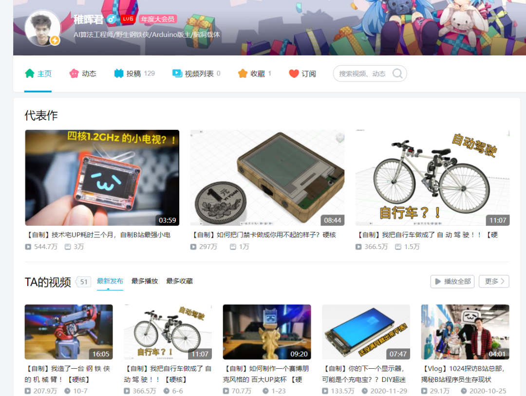 很多人第一次認識他,是因為他在B站發表的視頻:自動駕駛的自行車、鋼鐵俠的機械臂。