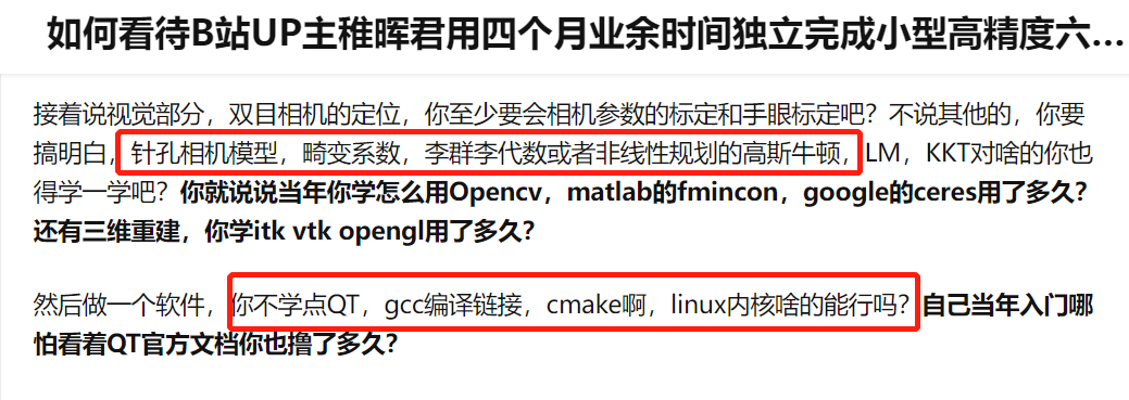 比如機械臂項目,光數學、物理方面就至少要用到:動力學方程、畸變係數,李羣李代數、非線性規劃的高斯牛頓……