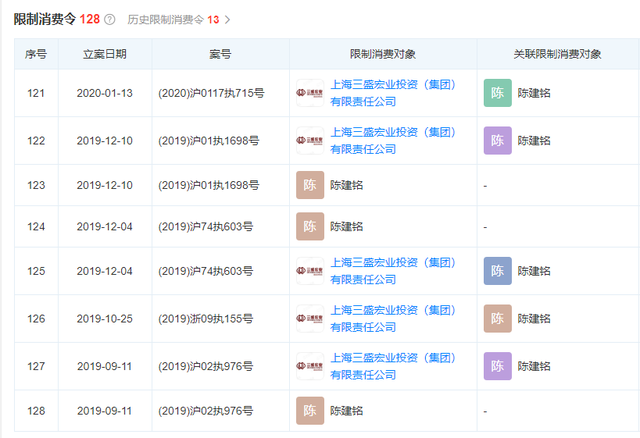 天眼查顯示,陳建銘共有128條被限制消費令,61次被執行記錄,被執行的總金額超103億元。