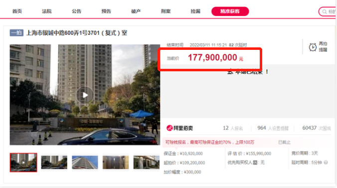 經過141次競拍,豪宅拍出了1.779億的天價,每平米30萬,打破該小區的價格記錄。