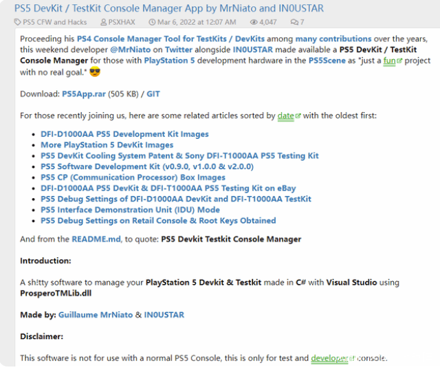 配上各種羣聊的誇大和有模有樣的截圖界面,彷彿真的下一秒PS5的源碼就要滿天飛了。但除了國內,其實根本沒有人討論這個消息。在順藤摸瓜到截圖的帖子主界面後,你會發現該貼發佈於3月6日,也並沒有寫上自己“破解了PS5”,而是作為開發機的開發套件調試工具,也明確寫上了“just a fun project with no real goal”。