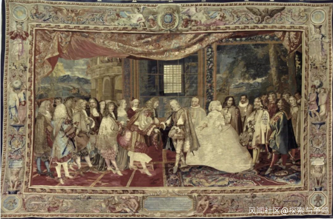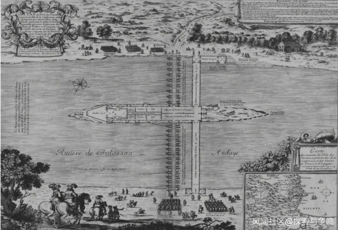 注:此圖是 1663—1676 年勒布朗(Charles Le Brun)為路易十四創作的《國王演義》(L’Histoire du roi))系列掛毯畫之一,圖中可以看到路易十四和菲利普四世腳下完全不同風格的地毯,其交接的中軸線正好對應了整個島上建築的中軸線。此畫現藏於法國國立傢俱館(Mobilier national de France),編號 GMTT-95-003。