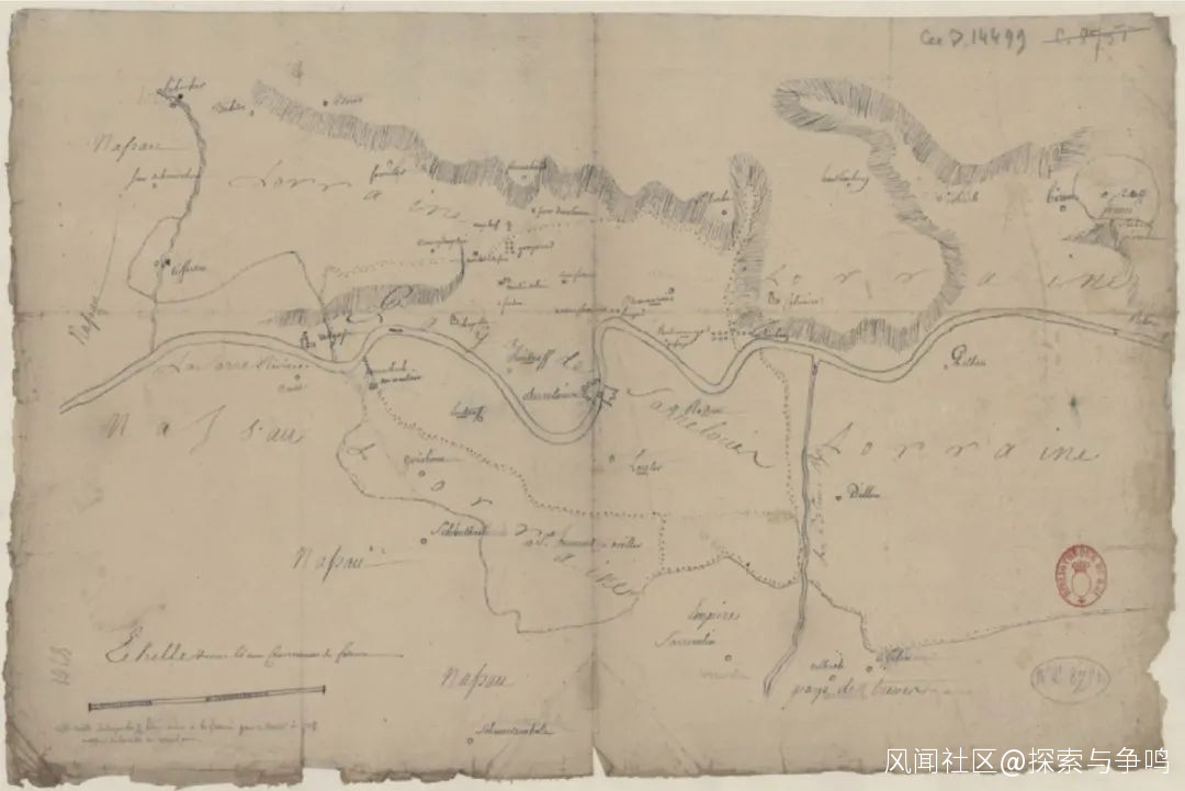 注:根據 1718 年《巴黎條約》第 2 條,法國的邊境線向前推進了約 2 公里,即圖中雙虛線所包括的薩爾路易斯市和博馬萊(Beaumarais)、恩斯多夫(Ensdorf)、福羅勞頓(Fraulautern)、里斯多夫(Lisdorf)、羅登(Roden)五個村莊。參見法國國家圖書館地圖部,館藏編號 GE D-14499。