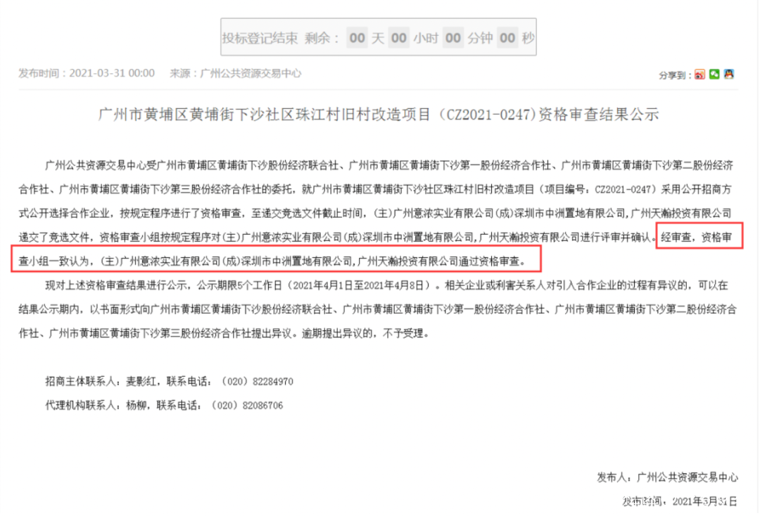 值得一提的是,進入到珠江村舊改合作企業資格公示的企業是一家聯合體公司,即是(主)廣州意濃實業有限公司(成)深圳市中洲置地有限公司,廣州天瀚投資有限公司。