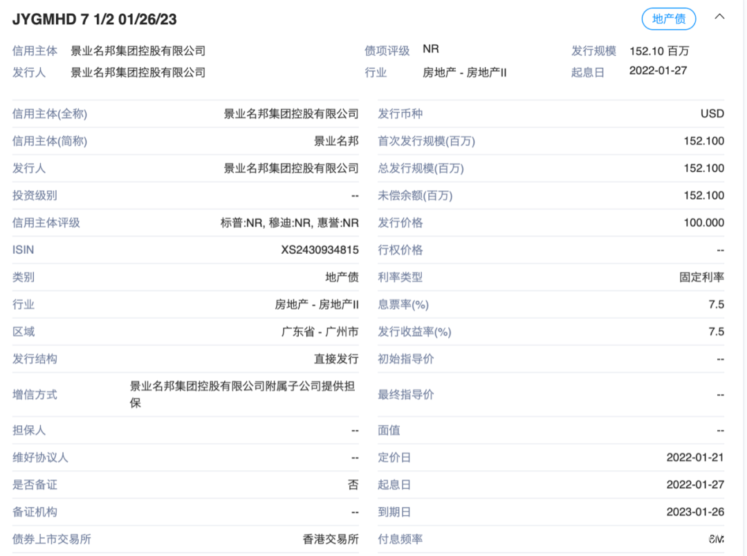 該筆美元債發行於2021年2月,於今年2月7日到期,發行規模1.55億美元。在到期之前景業名邦又新發行了一筆2023年到期的7.5釐優先票據,發行規模1.52億美元。實際上是對前一筆美元債的展期。