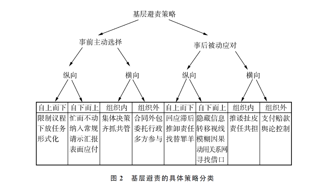 類型三:事後縱向策略。主要包括自上而下的避責策略和自下而上的避責策略。其中, 自上而下的避責策略有:回應滯後, 缺乏信息彙集、分析、預警機制, 緩慢處置和被動回應;推卸責任, 當出現不良後果時, 運用權力將責任推卸至下級承擔;找替罪羊, 在追責過程中相互推諉, 層層向下轉移責任, 讓權力鏈條末端的人員承擔處罰。自下而上的避責策略有:隱藏信息, 運用專業優勢對信息進行封鎖、隱藏或選擇性上報, 並採取技術手段處理網絡輿情;轉移視線, 製造新的危機和議題轉移上級關注焦點, 弱化那些執行困難、具有追責風險的任務;模糊因果, 在面臨上級追責時, 模糊前因後果的關係, 對自身行為進行正當性辯護, 企圖矇混過關;動用關係網, 藉助非正式關係網絡, 尋求上級庇護, 寬容已有過錯;尋找藉口, 將工作失誤歸咎於其他主客觀原因, 掩飾自身錯誤。