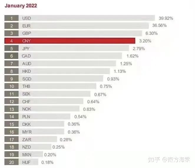 但人民幣的國際化的進程卻非常緩慢。從今年2月份的最新數字上來看,美元佔全球貨幣結算的39.92%,歐元佔36.56%,英鎊佔6.3%,人民幣也就是在2月份才剛剛超過日元,上升到第四位,佔比3.2%。