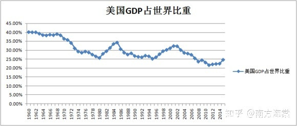 到了1960年,隨着歐洲國家經濟的復興,美國GDP佔比有所下降,為39.27%。但由於美國GDP的基數很大,美國當年的GDP是後面27國GDP的總和。