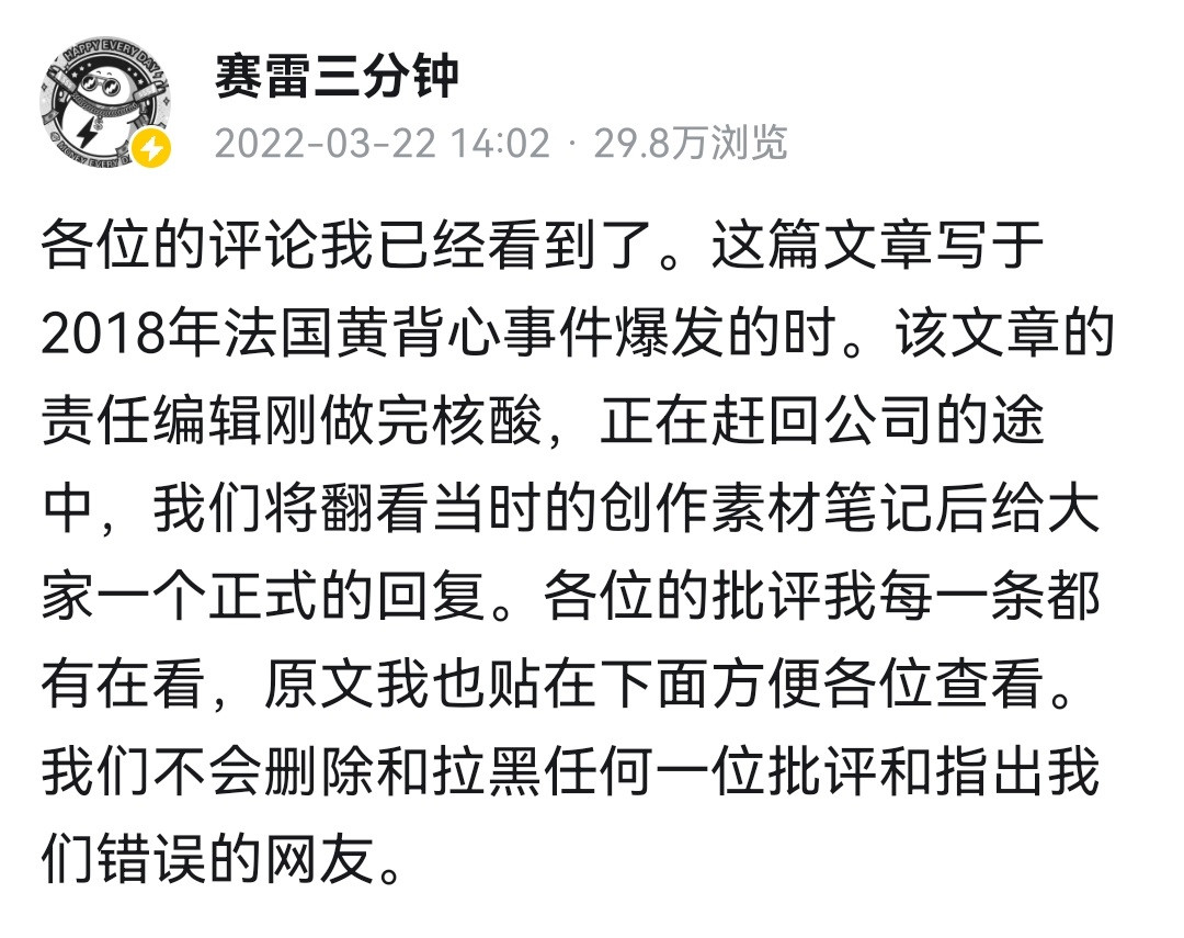 3月22日,自媒體“賽雷三分鐘”早年的一篇舊文,其中關於“巴黎公社”運動的敍述引發爭議。