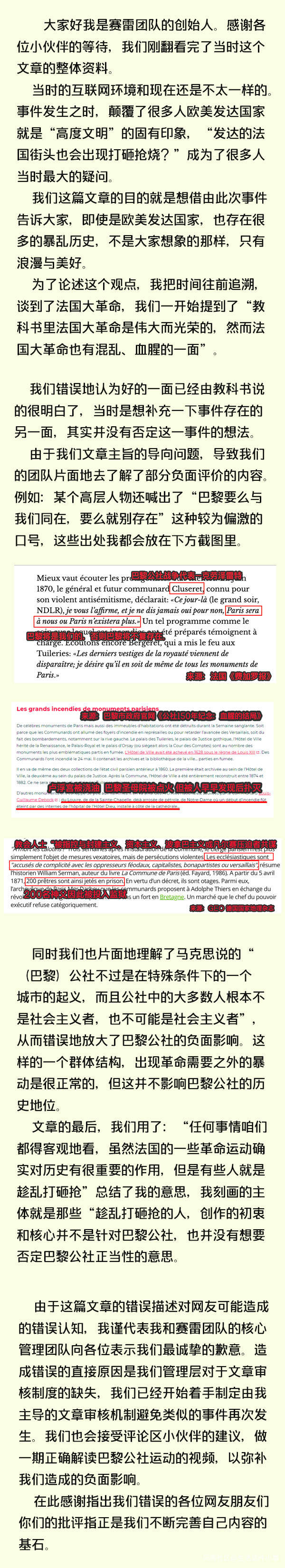 賽雷團隊表示,造成錯誤的直接原因是管理層對於文章審核制度的缺失,他們已經開始着手製定一套審核機制,避免類似的事件再次發生。接下來,賽雷團隊還將製作一期正確解讀“巴黎公社”運動的視頻,以彌補此次爭議造成的負面影響。