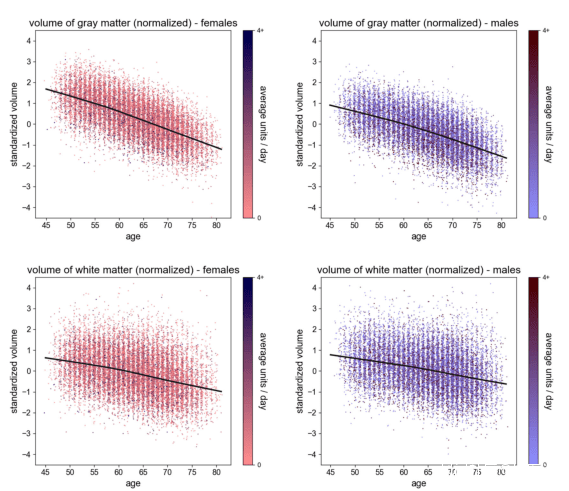 圖注:每日飲酒量與標準灰質體積、標準白質體積的關係